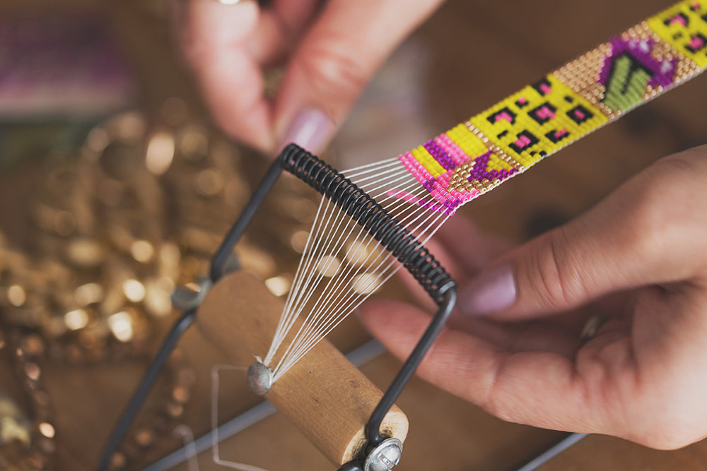 The necklace is woven by Sadie using traditional bead loom techniques. Length approx 45cm.